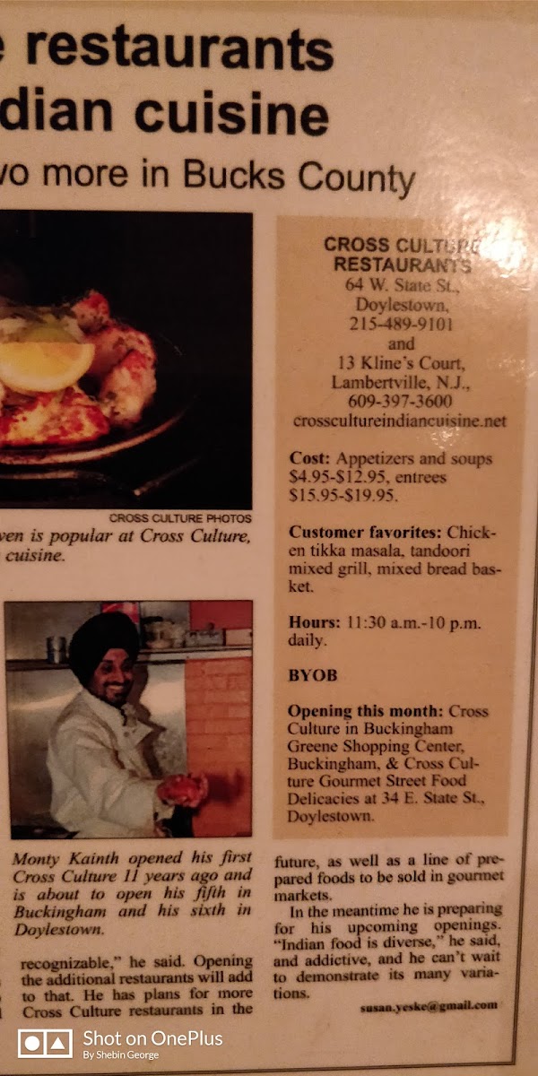 From a reviewer’s perspective, the menu at Cross Culture Indian Restaurant, located at 62-64 W State St, Doylestown, PA, feels like a thoughtful summary of classic Indian cuisine brought together under one roof. The lamb section stands out with rich, slow-cooked curries such as Lamb Rogan Josh, Lamb Achari, Lamb Saagwala, Lamb Nargisi, and Lamb Botli Masala, each highlighting different layers of spice and texture. Seafood lovers are equally well served with options like Fish or Shrimp Achari, Shrimp Karahi, Fish or Shrimp Vindaloo, and Fish or Shrimp Curry, offering both tangy and deeply spiced profiles. For vegetarians, the menu feels especially complete, ranging from comforting entrées like Aloo Gobhi, Palak Paneer, Malai Kofta, and Navratan Korma to crowd-pleasing starters such as Harabhara Kabab, Aloo Tikki, Vegetable Samosa, and Pakora. The tandoori selections, including Tandoori Mixed Grill, Shrimp Tandoori, Malai Chicken Kabab, Boti Kabab, and Tandoori Fish Tikka, add a smoky, grilled dimension that balances the saucier dishes. Classic chicken entrées like Chicken Tikka Masala, Chicken Saagwala, Chicken Korma, Chicken Vindaloo, and Chicken Cashmere provide familiar favorites, while aromatic rice dishes such as Lamb Biryani, Chicken Biryani, Shrimp Biryani, Vegetable Biryani, and the Chef Special Biryani round out the meal. Freshly baked breads like “Chef Special” Naan, Garlic Naan, Paneer Kulcha, Onion Kulcha, and Paratha are perfect for scooping up every sauce, complemented by sides like Mango Chutney, Raita, Achar, Dal Makhani, and Channa Masala. Finally, desserts such as Rasmalai, Gulab Jamun, Kulfi, Mango Sundae, and Vanilla Ice Cream, along with beverages like Sweet or Salted Lassi and Strawberry Lassi, provide a satisfying finish. Overall, the menu feels comprehensive and well-balanced, making it easy to see why this restaurant appeals to both newcomers to Indian food and seasoned fans alike.